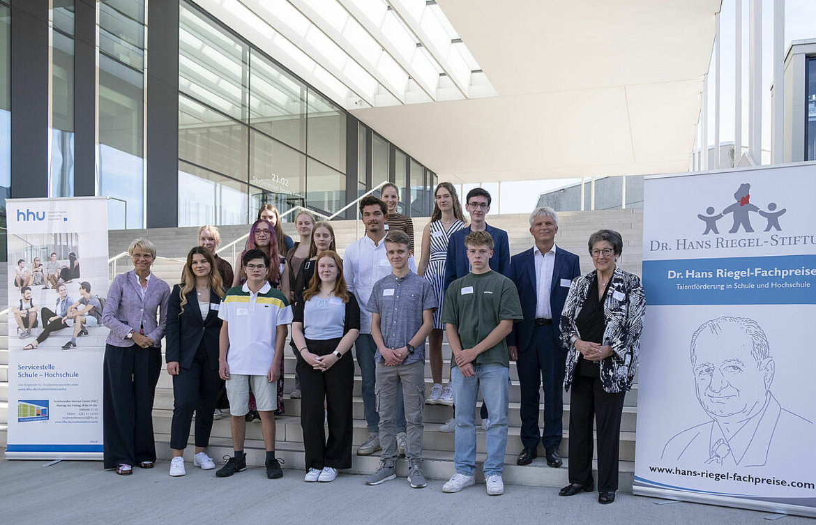 In ihren hervorragenden Facharbeiten in den MINT-Fächern Biologie, Chemie, Informatik, Mathematik und Physik hatten sie sich mit aktuell relevanten Themenstellungen beschäftigt: Der Effizienz von Wärmepumpen, der Funktionsweise von Windkraftanlagen, dem Trainieren einer KI oder dem Vorkommen von Regenwürmern und vielem mehr. Zusammen mit Schul- und Bildungsministerin Dorothee Feller und Rektorin Prof. Dr. Anja Steinbeck überreichte Prof. Ingeborg Henzler, Vorstandsmitglied der Dr. Hans Riegel-Stiftung, die Preise im Gesamtwert von 7.250 Euro an der HHU.
